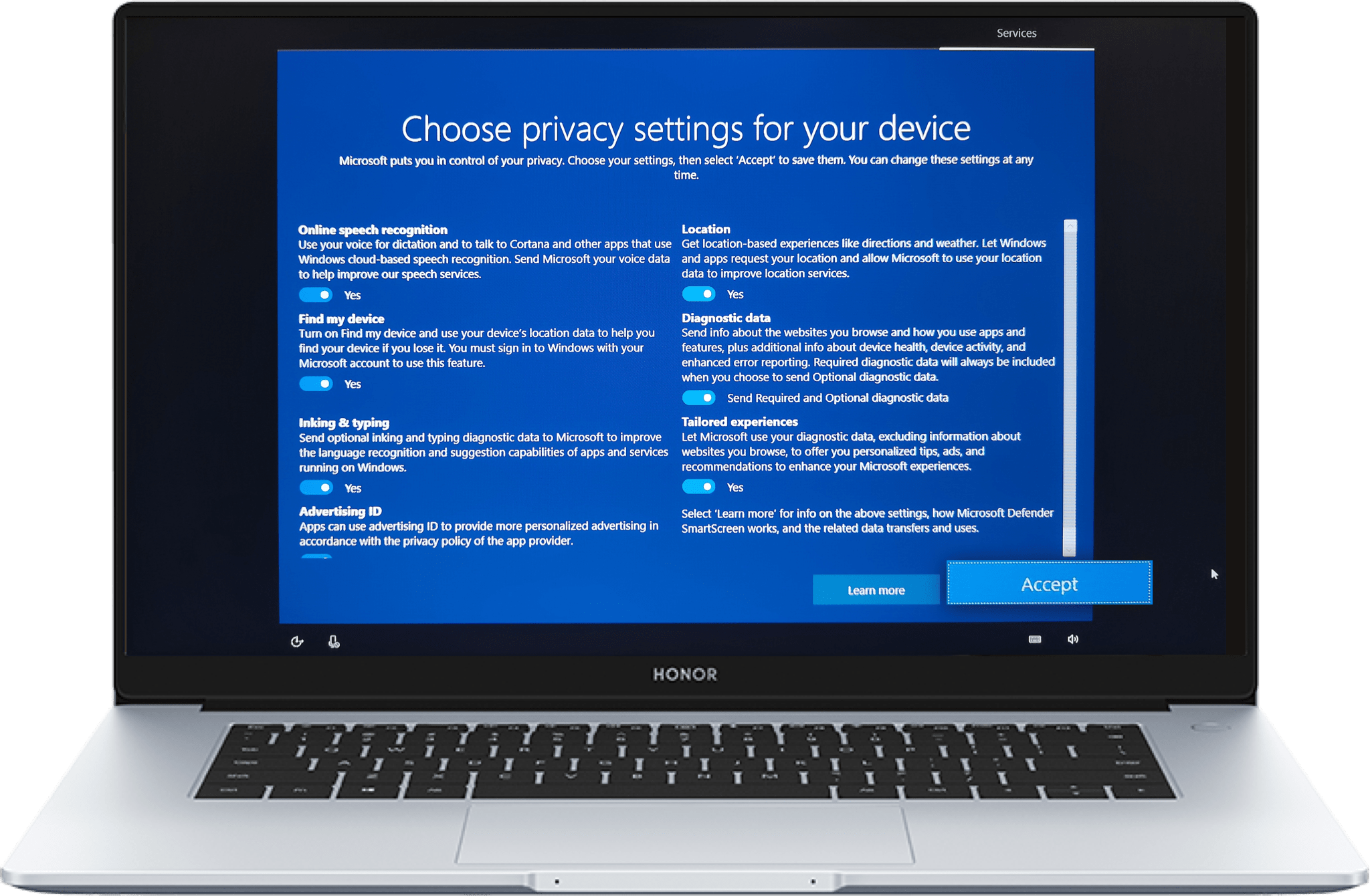 الموقع, وبيانات التشخيص والعناصر الأخرى في إعدادات الخصوصية. انقر فوق قبول للانتقال إلى الصفحة