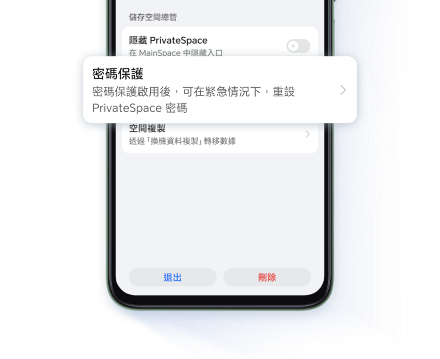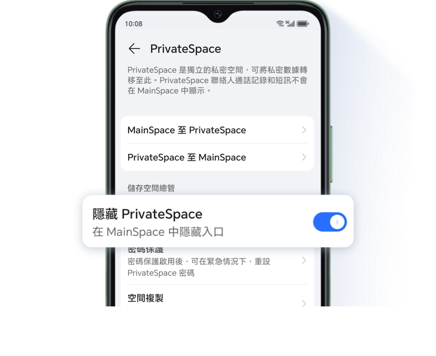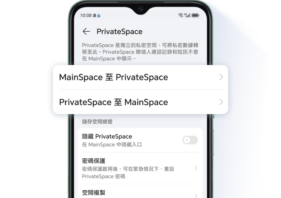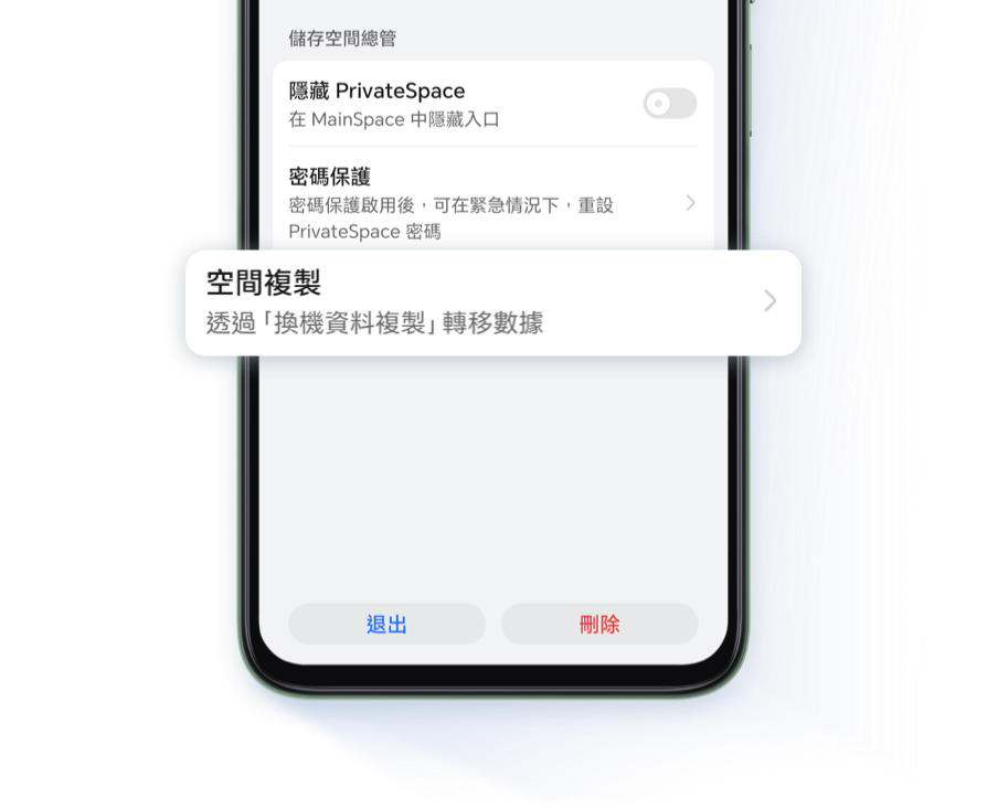 在PrivateSpace,進入設定>安全和私隱>裝置和數據保護>PrivateSpace>空間複製,可快速將舊裝置中「PrivateSpace」的聯絡人、圖片、文件等轉至新裝置「PrivateSpace」。