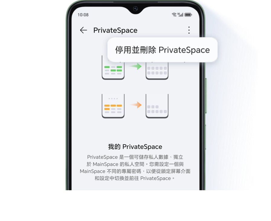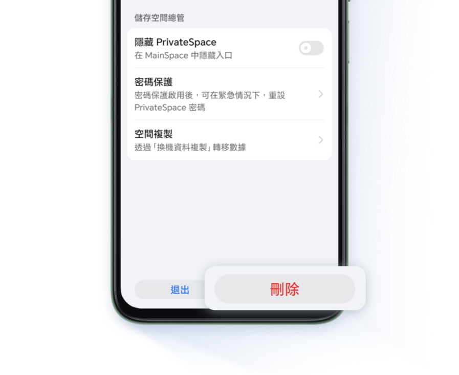 在PrivateSpace,進入設定>安全和私隱>裝置和數據保護>PrivateSpace,點選“MainSpace 至 PrivateSpace”,或“PrivateSpace 至 MainSpace”。